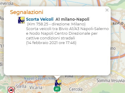 "Scorta Veicoli A1 milano-Napoli (Km 758.25 - direzione: Milano). Scorta veicoli tra Bivio A1/A3 Napoli-Salerno e Nodo Napoli Centro Direzionale per cattive condizioni stradali"