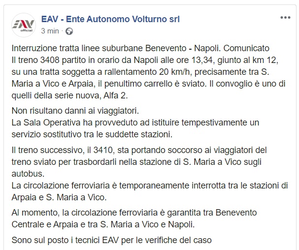 ATTENZIONE. Treno sviato dai binari sulla tratta Benevento-Napoli. Gli aggiornamenti