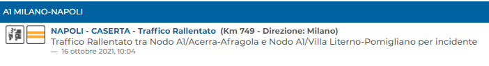 Lo apprendiamo dal sito di Autostrade per l'Italia: "Napoli- Caserta - Traffico Rallentato (Km 749 - Direzione: Milano) Traffico Rallentato tra Nodo A1/Acerra-Afragola - si legge - e Nodo A1/Villa Literno-Pomigliano per incidente".