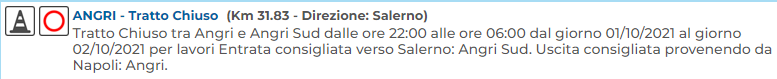Lo apprendiamo dal sito 'Autostrade per l'Italia': "Tratto Chiuso tra Angri e Angri Sud dalle ore 22:00 alle ore 06:00 dal giorno 01/10/2021 al giorno 02/10/2021 per lavori - si legge - Entrata consigliata verso Salerno: Angri Sud. Uscita consigliata provenendo da Napoli: Angri".