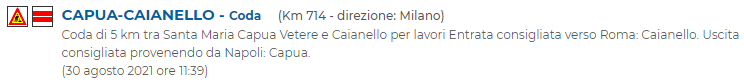 Lo apprendiamo dal sito di Autostrade per l'Italia: "Capua-Caianello - coda (km 714 - direzione: Milano). Coda di 5 km tra Santa Maria Capua Vetere e Caianello per lavori Entrata consigliata verso Roma: Caianello. Uscita consigliata - si legge - provenendo da Napoli: Capua. (30 agosto 2021 ore 11:39)"