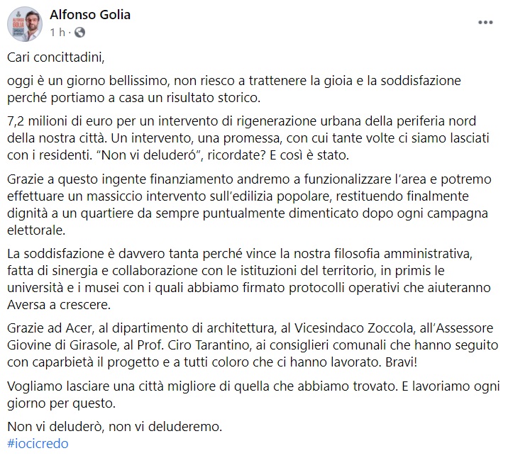 "Cari concittadini, oggi è un giorno bellissimo, non riesco a trattenere la gioia e la soddisfazione perché portiamo a casa un risultato storico. 7,2 milioni di euro per un intervento di rigenerazione urbana della periferia nord della nostra città. Un intervento, una promessa, con cui tante volte- si legge nella nota- ci siamo lasciati con i residenti. “Non vi deluderó”, ricordate? E così è stato. Grazie a questo ingente finanziamento andremo a funzionalizzare l’area e potremo effettuare un massiccio intervento sull’edilizia popolare, restituendo finalmente dignità a un quartiere da sempre puntualmente dimenticato dopo ogni campagna elettorale. La soddisfazione è davvero tanta perché vince la nostra filosofia amministrativa, fatta di sinergia e collaborazione con le istituzioni del territorio, in primis le università e i musei con i quali abbiamo firmato protocolli operativi che aiuteranno Aversa a crescere. Grazie ad Acer, al dipartimento di architettura, al Vicesindaco Zoccola, all’Assessore Giovine di Girasole, al Prof. Ciro Tarantino, ai consiglieri comunali che- si legge nella nota- hanno seguito con caparbietà il progetto e a tutti coloro che ci hanno lavorato. Bravi! Vogliamo lasciare una città migliore di quella che abbiamo trovato. E lavoriamo ogni giorno per questo. Non vi deluderò, non vi deluderemo."
