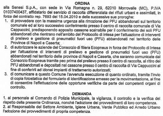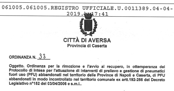 Questa l'ordinanza completa del Comune di Aversa in merito alla rimozione e avvio al recupero dei pneumatici fuori uso.