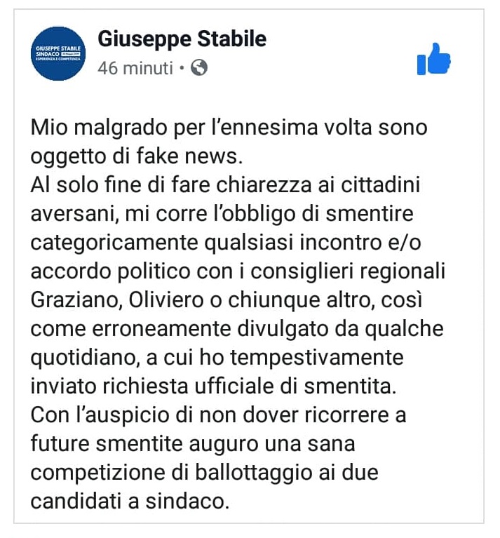 Questo quanto scritto dall'ormai ex candidato a Sindaco Giuseppe Stabile sulla propria pagina Fb