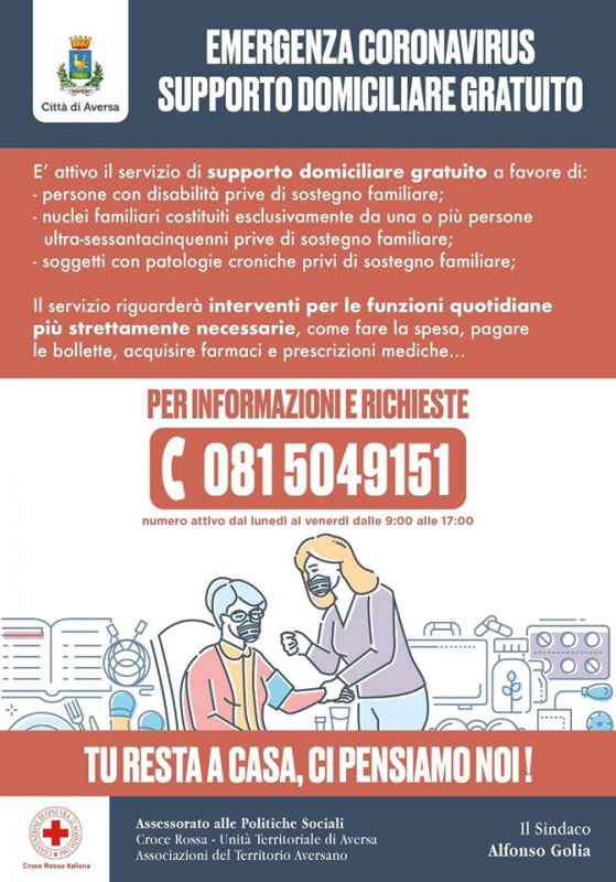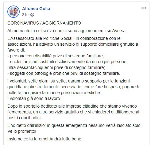 Al momento in cui scrivo non ci sono aggiornamenti su Aversa. L’Assessorato alle Politiche Sociali, in collaborazione con le associazioni, ha attivato un servizio di supporto domiciliare gratuito a favore di: - persone con disabilità prive di sostegno familiare; - nuclei familiari costituiti esclusivamente da una o più persone ultra-sessantacinquenni prive di sostegno familiare; - soggetti con patologie croniche privi di sostegno familiare. I volontari, sette giorni su sette, daranno supporto per le funzioni quotidiane più strettamente necessarie, come fare la spesa, pagare le bollette, acquisire farmaci e prescrizioni mediche. I volontari già sono a lavoro. Dopo lo sportello dedicato alle imprese cittadine che stanno vivendo l’emergenza, un altro servizio gratuito che vi chiederei di diffondere ai nostri concittadini. L’ho detto dall’inizio: in questa emergenza nessuno verrà lasciato solo. Ve lo prometto! Insieme ce la faremo! Andrà tutto bene."