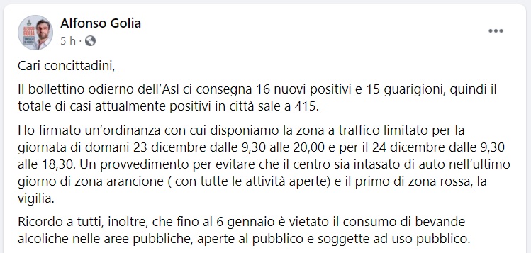 Questo quanto pubblicato sulla pagina del Sindaco di Aversa