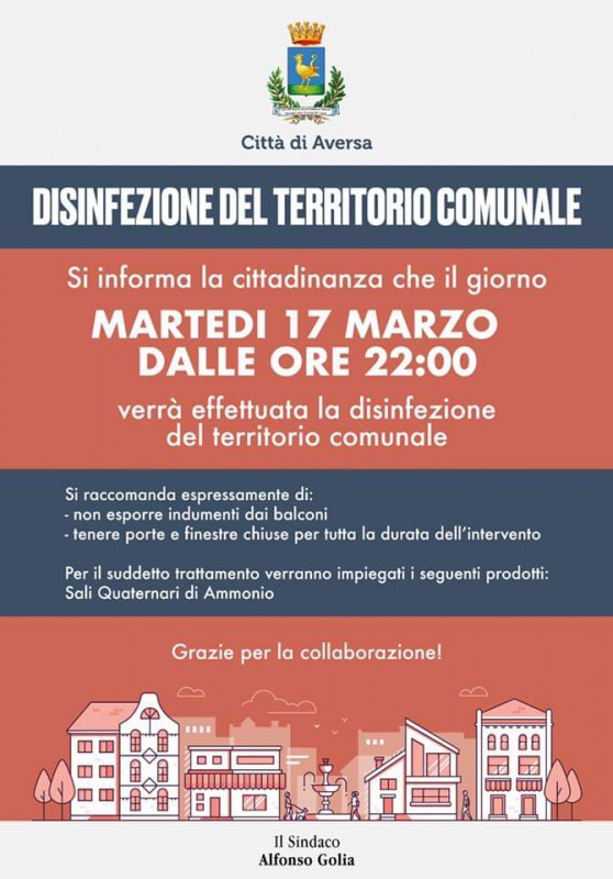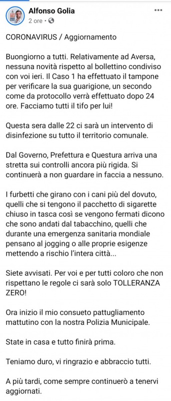 Buongiorno a tutti. Relativamente ad Aversa, nessuna novità rispetto al bollettino condiviso con voi ieri. Il Caso 1 ha effettuato il tampone per verificare la sua guarigione, un secondo come da protocollo verrà effettuato dopo 24 ore. Facciamo tutti il tifo per lui! Questa sera dalle 22 ci sarà un intervento di disinfezione su tutto il territorio comunale. Dal Governo, Prefettura e Questura arriva una stretta sui controlli ancora più rigida. Si continuerà a non guardare in faccia a nessuno. I furbetti che girano con i cani più del dovuto, quelli che si tengono il pacchetto di sigarette chiuso in tasca così se vengono fermati dicono che sono andati dal tabacchino, quelli che durante una emergenza sanitaria mondiale pensano al jogging o alle proprie esigenze mettendo a rischio l’intera città... Siete avvisati. Per voi e per tutti coloro che non rispettano le regole ci sarà solo TOLLERANZA ZERO! Ora inizio il mio consueto pattugliamento mattutino con la nostra Polizia Municipale. State in casa e tutto finirà prima. Teniamo duro, vi ringrazio e abbraccio tutti. A più tardi, come sempre continuerò a tenervi aggiornati. Andrà tutto bene."