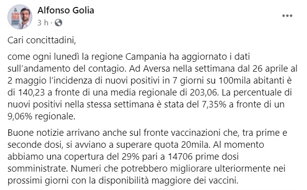 "Cari concittadini, come ogni lunedì la regione Campania ha aggiornato i dati sull’andamento del contagio. Ad Aversa nella settimana dal 26 aprile al 2 maggio l’incidenza di nuovi positivi in 7 giorni su 100mila abitanti è di 140,23 a fronte di una media regionale di 203,06. -Si legge nella nota- La percentuale di nuovi positivi nella stessa settimana è stata del 7,35% a fronte di un 9,06% regionale. Buone notizie arrivano anche sul fronte vaccinazioni che, tra prime e seconde dosi, si avviano a superare quota 20mila. -Si legge nella nota- Al momento abbiamo una copertura del 29% pari a 14706 prime dosi somministrate. Numeri che potrebbero migliorare ulteriormente nei prossimi giorni con la disponibilità maggiore dei vaccini."