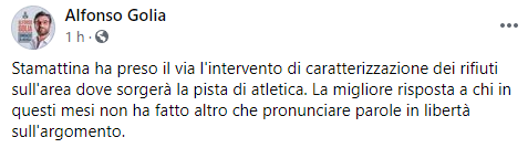Questo il post pubblicato sulla sua pagina Facebook dal Sindaco di Aversa Alfonso Golia: "Stamattina ha preso il via l'intervento di caratterizzazione dei rifiuti - si legge nel post - sull'area dove sorgerà la pista di atletica. La migliore risposta a chi in questi mesi non ha fatto altro che pronunciare parole in libertà sull'argomento".