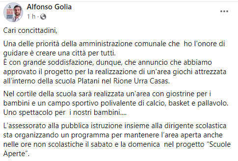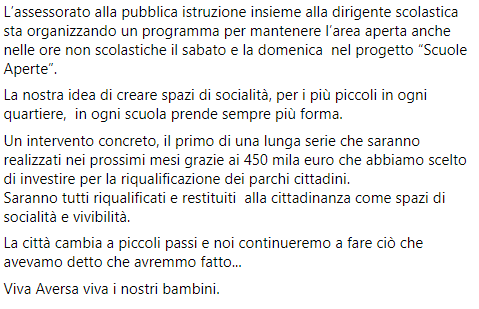 Questo il post pubblicato sulla sua pagina Facebook dal Sindaco di Aversa Alfonso Golia: "Cari concittadini. Una delle priorità della amministrazione comunale che ho l'onore di guidare è creare una città per tutti. È con grande soddisfazione, dunque, che annuncio che abbiamo approvato il progetto per la realizzazione di un'area giochi attrezzata - si legge nel post - all’interno della scuola Platani nel Rione Urra Casas. Nel cortile della scuola sarà realizzata un'area con giostrine per i bambini e un campo sportivo polivalente di calcio, basket e pallavolo. Uno spettacolo per i nostri bambini.... L’assessorato alla pubblica istruzione - si legge ancora - insieme alla dirigente scolastica sta organizzando un programma per mantenere l’area aperta anche nelle ore non scolastiche il sabato e la domenica nel progetto “Scuole Aperte”. La nostra idea di creare spazi di socialità, per i più piccoli in ogni quartiere, in ogni scuola prende sempre più forma. Un intervento concreto - prosegue il post - il primo di una lunga serie che saranno realizzati nei prossimi mesi grazie ai 450 mila euro che abbiamo scelto di investire per la riqualificazione dei parchi cittadini. Saranno tutti riqualificati e restituiti alla cittadinanza come spazi di socialità e vivibilità. La città cambia a piccoli passi - conclude il post - e noi continueremo a fare ciò che avevamo detto che avremmo fatto... Viva Aversa viva i nostri bambini".