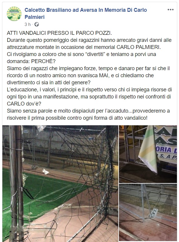 Atti vandalici con danneggiamento delle strutture sportive. Questo quanto apprendiamo dalla pagina FB Calcetto Brasiliano