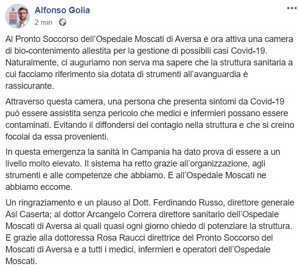 Questo quanto apprendiamo dalla pagina facebook del Sindaco Golia:
