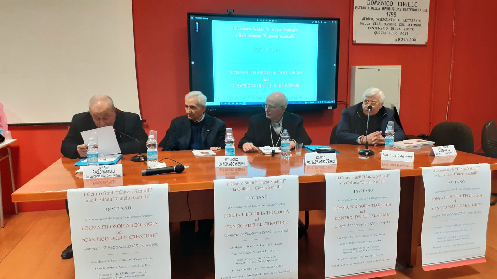 Aula Magna del liceo 'Cirillo' di Aversa gremita per la presentazione del libro di Don Fernando Angelino dal titolo: 'Poesia Filosofia Teologia nel Cantico delle Creature' edito dalla Collana e Centro Studi 'Cinzia Santulli'. Dopo il saluto del Dirigente Scolastico del liceo, dott. Luigi Izzo, c'e' stata la presentazione del Testo da parte di Sua Eccellenza Rev. Arcivescovo Alessandro D'Errico, Nunzio Apostolico. A chiudere l'incontro l'On. Paolo Santulli, patron del Centro Studi e della Collana 'Cinzia Santulli'. Ha coordinato i lavori il Prof. Vincenzo D'Agostino.