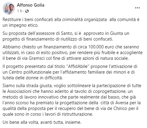 Questo il post pubblicato sulla sua pagina Facebook dal Sindaco di Aversa Alfonso Golia: "Restituire i beni confiscati alla criminalità organizzata alla comunità è un impegno etico. Su proposta dell’assessore di Santo, si è approvato in Giunta un progetto di finanziamento di riutilizzo di beni confiscati. Abbiamo chiesto - si legge nel post - un finanziamento di circa 100.000 euro che saranno utilizzati, in caso di esito positivo, per rendere più fruibile e accogliente il bene di via Gramsci col fine di attivare azioni di natura sociale. Il progetto presentato dal titolo "AffidAbile" propone l'attivazione di un Centro polifunzionale per l’affidamento familiare dei minori e di tutela delle donne in difficoltà. Siamo sulla strada giusta - si legge ancora - voglio sottolineare la partecipazione di tutte le Associazioni che hanno aderito al tavolo di coprogettazione, un metodo di lavoro innovativo che parte realmente dal basso, che già l’anno scorso ha premiato la progettazione della città di Aversa per la qualità della proposta per il recupero del bene di via de Chirico - prosegue il post - per il quale sono in corso i lavori di ristrutturazione. Un bene alla volta, avanti tutta, insieme".