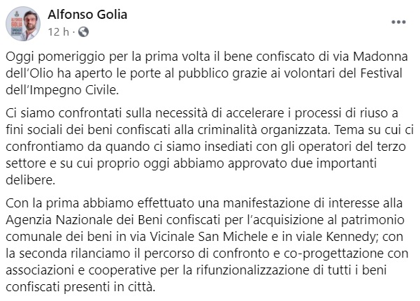 Questo quanto pubblicato sulla pagina fb del Sindaco Golia: "Oggi pomeriggio per la prima volta il bene confiscato di via Madonna dell’Olio ha aperto le porte al pubblico grazie ai volontari del Festival dell’Impegno Civile. Ci siamo confrontati sulla necessità di accelerare i processi di riuso a fini sociali dei beni confiscati alla criminalità organizzata. Tema - si legge nella nota - su cui ci confrontiamo da quando ci siamo insediati con gli operatori del terzo settore e su cui proprio oggi abbiamo approvato due importanti delibere. Con la prima abbiamo effettuato una manifestazione di interesse alla Agenzia Nazionale dei Beni confiscati per l’acquisizione al patrimonio comunale dei beni in via Vicinale San Michele e in viale Kennedy; con la seconda rilanciamo il percorso di confronto e co-progettazione con associazioni e cooperative - si legge nella nota - per la rifunzionalizzazione di tutti i beni confiscati presenti in città."