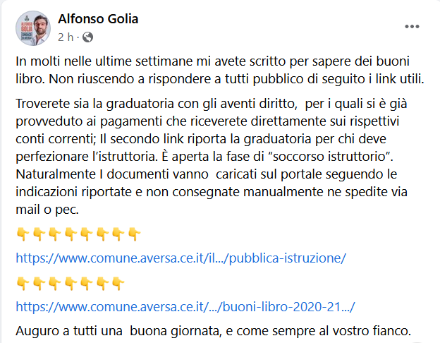 Questo il post pubblicato sulla pagina Facebook del sindaco di Aversa, Alfonso Golia: "In molti nelle ultime settimane mi avete scritto per sapere dei buoni libro. Non riuscendo a rispondere a tutti pubblico di seguito i link utili. Troverete sia la graduatoria con gli aventi diritto, per i quali si è già provveduto ai pagamenti che riceverete direttamente sui rispettivi conti correnti; Il secondo link - si legge - riporta la graduatoria per chi deve perfezionare l’istruttoria. È aperta la fase di “soccorso istruttorio”. Naturalmente - conclude - I documenti vanno caricati sul portale seguendo le indicazioni riportate e non consegnate manualmente ne spedite via mail o pec. CLICCA QUI e CLICCA QUI Auguro a tutti una buona giornata, e come sempre al vostro fianco".