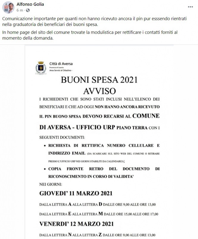 "Comunicazione importante per quanti non hanno ricevuto ancora il pin pur esssendo rientrati nella graduatoria dei beneficiari dei buoni spesa. In home page del sito del comune- si legge nella nota- trovate la modulistica per rettificare i contatti forniti al momento della domanda."