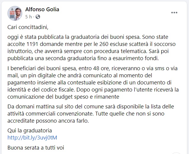 Questo quanto apprendiamo dalla pagina fb del Sindaco Golia: "Cari concittadini, oggi è stata pubblicata la graduatoria dei buoni spesa. Sono state accolte 1191 domande mentre per le 260 escluse scatterà il soccorso istruttorio - si legge nella nota -, che avverrà sempre con procedura telematica. Sarà poi pubblicata una seconda graduatoria fino a esaurimento fondi. I beneficiari dei buoni spesa, entro 48 ore, riceveranno o via sms o via mail, un pin digitale che andrà comunicato al momento del pagamento insieme alla contestuale esibizione di un documento di identità e del codice fiscale. Dopo ogni pagamento - si legge nella nota - l'utente riceverà la comunicazione del budget speso e rimanente Da domani mattina sul sito del comune sarà disponibile la lista delle attività commerciali convenzionate. Tutte quelle che non si sono accreditate possono ancora farlo. Qui la graduatoria http://bit.ly/3uvj0tM Buona serata a tutti voi".