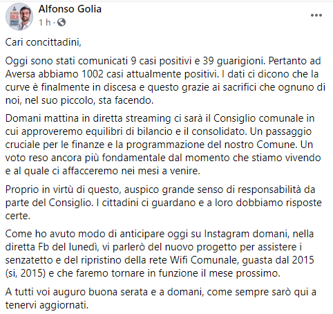 Lo apprendiamo dalla pagina Facebook del Sindaco di Aversa Alfonso Golia
