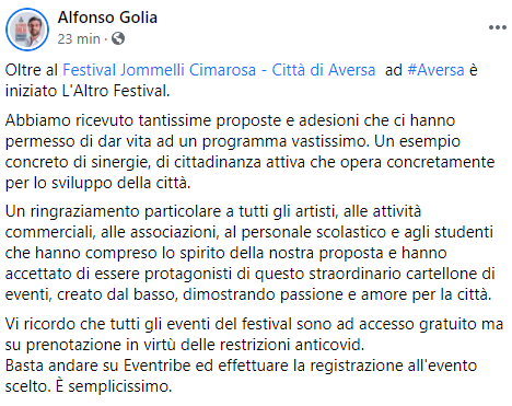 Questo il post pubblicato sulla sua pagina Facebook dal Sindaco di Aversa Alfonso Golia: "Oltre al Festival Jommelli Cimarosa - Città di Aversa ad Aversa è iniziato L'Altro Festival. Abbiamo ricevuto tantissime proposte e adesioni che ci hanno permesso di dar vita ad un programma vastissimo. Un esempio - si legge nel post - concreto di sinergie, di cittadinanza attiva che opera concretamente per lo sviluppo della città. Un ringraziamento particolare a tutti gli artisti, alle attività commerciali, alle associazioni, al personale scolastico e agli studenti che hanno compreso lo spirito della nostra proposta e hanno accettato - prosegue il post - di essere protagonisti di questo straordinario cartellone di eventi, creato dal basso, dimostrando passione e amore per la città. Vi ricordo che tutti gli eventi del festival sono ad accesso gratuito ma su prenotazione in virtù delle restrizioni anticovid. Basta andare - conclude il post - su Eventribe ed effettuare la registrazione all'evento scelto. È semplicissimo".