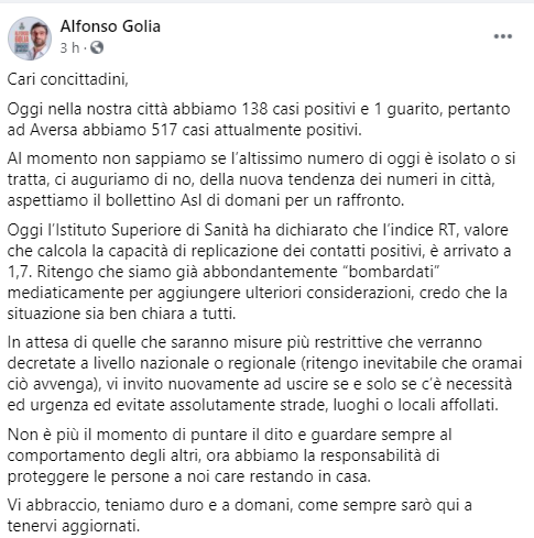 Lo apprendiamo dalla pagina Facebook del Sindaco di Aversa Alfonso Golia