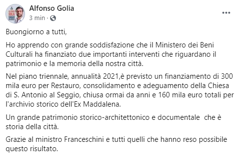 Questo il post pubblicato dal Sindaco di Aversa Alfonso Golia sulla sua pagina Facebook: "Buongiorno a tutti. Ho apprendo con grande soddisfazione che il Ministero dei Beni Culturali ha finanziato due importanti interventi che riguardano il patrimonio e la memoria della nostra città. Nel piano triennale - si legge nel post - annualità 2021,è previsto un finanziamento di 300 mila euro per Restauro, consolidamento e adeguamento della Chiesa di S. Antonio al Seggio, chiusa ormai da anni e 160 mila euro totali per l'archivio storico dell'Ex Maddalena. Un grande patrimonio storico-architettonico e documentale che è storia della città. Grazie - conclude il Sindaco - al ministro Franceschini e tutti quelli che hanno reso possibile questo risultato".