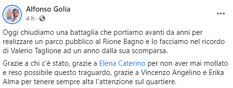 Questo il post pubblicato dal Sindaco di Aversa Alfonso Golia sulla sua pagina Facebook: "Oggi chiudiamo una battaglia che portiamo avanti da anni per realizzare un parco pubblico al Rione Bagno - si legge nel post - e lo facciamo nel ricordo di Valerio Taglione ad un anno dalla sua scomparsa. Grazie a chi c'è stato, grazie a Elena Caterino per non aver mai mollato - prosegue il post - e reso possibile questo traguardo, grazie a Vincenzo Angelino e Erika Alma per tenere sempre alta l'attenzione sul quartiere".