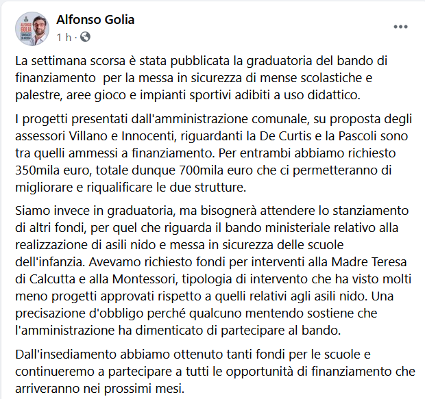Questo il post pubblicato dal sindaco di Aversa, Alfonso Golia, sulla sua pagina Facebook: "La settimana scorsa è stata pubblicata la graduatoria del bando di finanziamento per la messa in sicurezza di mense scolastiche e palestre, aree gioco e impianti sportivi adibiti a uso didattico. I progetti presentati dall'amministrazione comunale, su proposta degli assessori Villano e Innocenti, riguardanti la De Curtis e la Pascoli sono tra quelli ammessi a finanziamento. Per entrambi - si legge - abbiamo richiesto 350mila euro, totale dunque 700mila euro che ci permetteranno di migliorare e riqualificare le due strutture. Siamo invece in graduatoria, ma bisognerà attendere lo stanziamento di altri fondi, per quel che riguarda il bando ministeriale relativo alla realizzazione di asili nido e messa in sicurezza delle scuole dell'infanzia. Avevamo richiesto fondi - recita il post - per interventi alla Madre Teresa di Calcutta e alla Montessori, tipologia di intervento che ha visto molti meno progetti approvati rispetto a quelli relativi agli asili nido. Una precisazione d'obbligo perché qualcuno mentendo sostiene che l'amministrazione ha dimenticato di partecipare al bando. Dall'insediamento abbiamo ottenuto tanti fondi per le scuole e continueremo a partecipare a tutti le opportunità di finanziamento che arriveranno nei prossimi mesi - conclude".