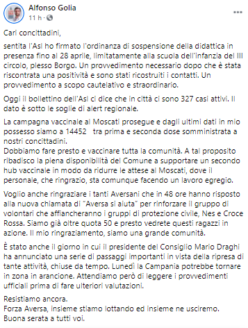 Questo il post pubblicato dal Sindaco di Aversa Alfonso Golia sulla sua pagina Facebook: "Cari concittadini, sentita l'Asl ho firmato l'ordinanza di sospensione della didattica in presenza fino al 28 aprile, limitatamente alla scuola dell'infanzia del III circolo, plesso Borgo. Un provvedimento - si legge nel post - necessario dopo che è stata riscontrata una positività e sono stati ricostruiti i contatti. Un provvedimento a scopo cautelativo e straordinario. Oggi il bollettino dell'Asl ci dice che in città ci sono 327 casi attivi. Il dato è sotto le soglie di alert regionale. La campagna vaccinale al Moscati - si legge ancora nel post - prosegue e dagli ultimi dati in mio possesso siamo a 14452 tra prima e seconda dose somministrata a nostri concittadini. Dobbiamo fare presto e vaccinare tutta la comunità. A tal proposito ribadisco la piena disponibilità del Comune a supportare un secondo hub vaccinale in modo da ridurre le attese al Moscati, dove il personale, che ringrazio, sta comunque facendo un lavoro egregio. Voglio anche ringraziare - prosegue il Sindaco - i tanti Aversani che in 48 ore hanno risposto alla nuova chiamata di “Aversa si aiuta” per rinforzare il gruppo di volontari che affiancheranno i gruppi di protezione civile, Nes e Croce Rossa. Siamo già oltre quota 50 e presto vedrete questi ragazzi in azione. Il mio ringraziamento, siamo una grande comunità. È stato anche il giorno in cui il presidente del Consiglio Mario Draghi ha annunciato una serie di passaggi importanti in vista della ripresa di tante attività, chiuse da tempo. Lunedì - continua il post - la Campania potrebbe tornare in zona in arancione (il Governo ha confermato nel pomeriggio di ieri ndr). Attendiamo però di leggere i provvedimenti ufficiali prima di fare ulteriori valutazioni. Resistiamo ancora. Forza Aversa, insieme stiamo lottando ed insieme ne usciremo. Buona serata a tutti voi".