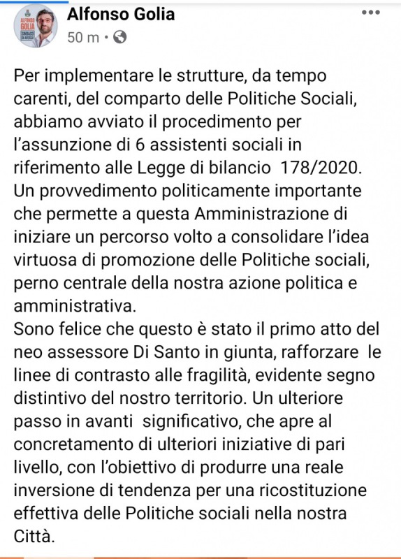 "Per implementare le strutture, da tempo carenti, del comparto delle Politiche Sociali, abbiamo avviato il procedimento per l’assunzione di 6 assistenti sociali in riferimento alle Legge di bilancio 178/2020. Un provvedimento politicamente importante che permette a questa Amministrazione di iniziare un percorso volto a consolidare l’idea virtuosa di promozione delle Politiche sociali, perno centrale della nostra azione politica e amministrativa. Sono felice che questo è stato il primo atto del neo assessore Di Santo in giunta, rafforzare le linee di contrasto alle fragilità, evidente segno distintivo del nostro territorio. Un ulteriore passo in avanti significativo, che apre al concretamento di ulteriori iniziative di pari livello, con l’obiettivo di produrre una reale inversione di tendenza per una ricostituzione effettiva delle Politiche sociali nella nostra Città."