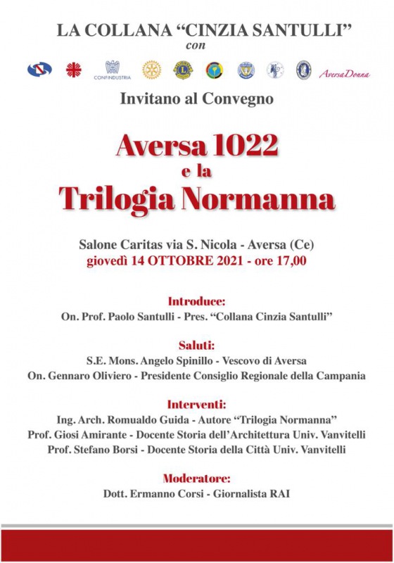 Nella giornata di giovedì 14 ottobre, alle ore 17 presso il Salone Caritas di via S. Nicola ad Aversa, la Collana 'Cinzia Santulli' terrà il convegno 'Aversa 1022 e la Trilogia Normanna'. Tanti gli intereventi illustri, tra cui il Pres. della Collana 'Cinzia Santulli' ed On. Paolo Santulli, S.E. Mons. Spinillo, l'On. Gennaro Oliviero e tanti altri.