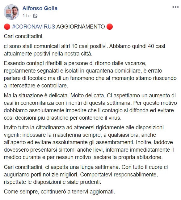 Questo quanto pubblicato sulla pagina facebook del Sindaco Golia: