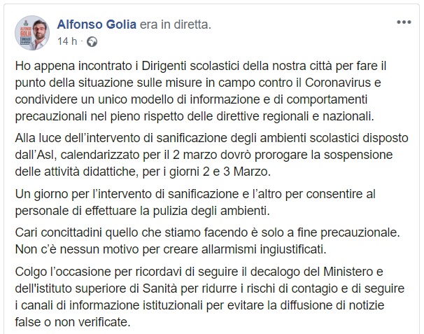 Questo quanto apprendiamo dalla pagina FB del Sindaco Golia