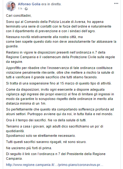 "Cari concittadini, Sono qui al Comando della Polizia Locale di Aversa, ho appena terminato una serie di contatti con le forze dell’ordine e naturalmente con il dipartimento di prevenzione e con i sindaci dell’agro. Nessuna novità relativamente alla nostra città, ma come ben sapete questo dato non deve assolutamente far abbassare la guardia. Restano in vigore le disposizioni presenti nell’ordinanza n.7 della Regione Campania e il vademecum della Protezione Civile sulle regole da seguire. Approfitto per ribadire che l’inosservanza di tale ordinanza costituisce violazione penalmente rilevante, oltre che mettere a rischio la salute di tutti e vanificare il grande sacrificio che tutti stiamo facendo. Si tratta di una sospensione fino al 15 marzo di questo tipo di attivitá. Come da disposizioni, invito ogni esercente a disporre adeguata vigilanza agli ingressi dei propri esercizi al fine di limitare gli ingressi in modo da garantire lo scrupoloso rispetto delle ordinanze in merito alla distanza minima di un 1m. So perfettamente che questo sta comportando sofferenza profonda ad alcuni settori. Purtroppo avviene qui da noi, in tutta Italia e nel mondo. Ora è il tempo dei sacrifici. Ne va della salute di tutti. Teniamo a casa i giovani, agli adulti dico sacrifichiamo un po’ di quotidianità. Spostiamoci solo se strettamente necessario. Tutti questi sacrifici saranno ripagati, né sono sicuro. Ne usciremo più forti di prima. Di seguito il link con l’ordinanza n 7 del Presidente della Regione Campania.