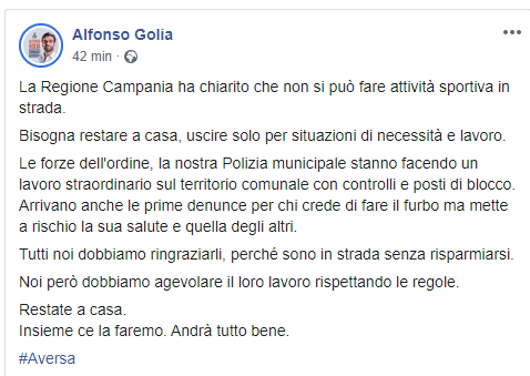 "La Regione Campania ha chiarito che non si può fare attività sportiva in strada. Bisogna restare a casa, uscire solo per situazioni di necessità e lavoro. Le forze dell'ordine, la nostra Polizia municipale stanno facendo un lavoro straordinario sul territorio comunale con controlli e posti di blocco. Arrivano anche le prime denunce per chi crede di fare il furbo ma mette a rischio la sua salute e quella degli altri. Tutti noi dobbiamo ringraziarli, perché sono in strada senza risparmiarsi. Noi però dobbiamo agevolare il loro lavoro rispettando le regole. Restate a casa. Insieme ce la faremo. Andrà tutto bene."