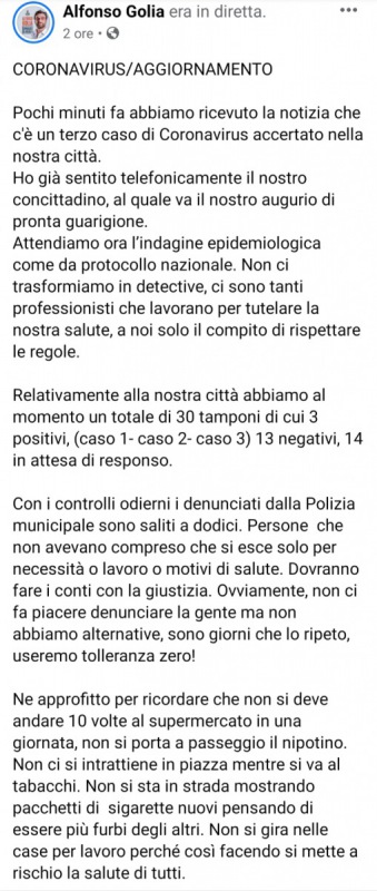 Pochi minuti fa abbiamo ricevuto la notizia che c'è un terzo caso di Coronavirus accertato nella nostra città.