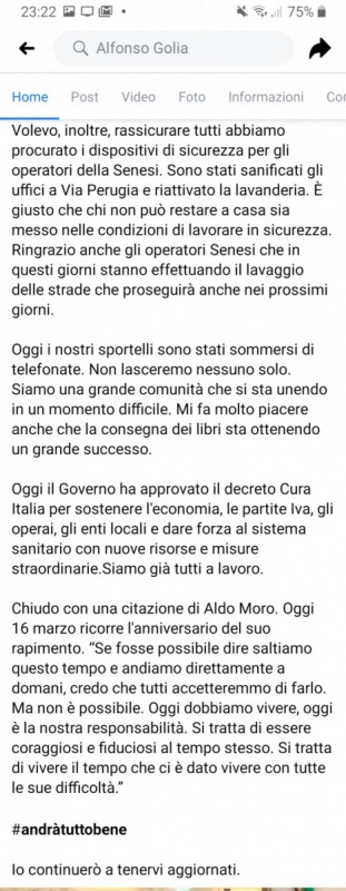 Attendiamo ora l’indagine epidemiologica come da protocollo nazionale. Non ci trasformiamo in detective, ci sono tanti professionisti che lavorano per tutelare la nostra salute, a noi solo il compito di rispettare le regole. Relativamente alla nostra città abbiamo al momento un totale di 30 tamponi di cui 3 positivi, (caso 1- caso 2- caso 3) 13 negativi, 14 in attesa di responso. Con i controlli odierni i denunciati dalla Polizia municipale sono saliti a dodici. Persone che non avevano compreso che si esce solo per necessità o lavoro o motivi di salute. Dovranno fare i conti con la giustizia. Ovviamente, non ci fa piacere denunciare la gente ma non abbiamo alternative, sono giorni che lo ripeto, useremo tolleranza zero! Ne approfitto per ricordare che non si deve andare 10 volte al supermercato in una giornata, non si porta a passeggio il nipotino. Non ci si intrattiene in piazza mentre si va al tabacchi. Non si sta in strada mostrando pacchetti di sigarette nuovi pensando di essere più furbi degli altri. Non si gira nelle case per lavoro perché così facendo si mette a rischio la salute di tutti. Volevo, inoltre, rassicurare tutti abbiamo procurato i dispositivi di sicurezza per gli operatori della Senesi. Sono stati sanificati gli uffici a Via Perugia e riattivato la lavanderia. È giusto che chi non può restare a casa sia messo nelle condizioni di lavorare in sicurezza. Ringrazio anche gli operatori Senesi che in questi giorni stanno effettuando il lavaggio delle strade che proseguirà anche nei prossimi giorni. Oggi i nostri sportelli sono stati sommersi di telefonate. Non lasceremo nessuno solo. Siamo una grande comunità che si sta unendo in un momento difficile. Mi fa molto piacere anche che la consegna dei libri sta ottenendo un grande successo. Oggi il Governo ha approvato il decreto Cura Italia per sostenere l'economia, le partite Iva, gli operai, gli enti locali e dare forza al sistema sanitario con nuove risorse e misure straordinarie.Siamo già tutti a lavoro.Chiudo con una citazione di Aldo Moro. Oggi 16 marzo ricorre l'anniversario del suo rapimento. “Se fosse possibile dire saltiamo questo tempo e andiamo direttamente a domani, credo che tutti accetteremmo di farlo. Ma non è possibile. Oggi dobbiamo vivere, oggi è la nostra responsabilità. Si tratta di essere coraggiosi e fiduciosi al tempo stesso. Si tratta di vivere il tempo che ci è dato vivere con tutte le sue difficoltà.”