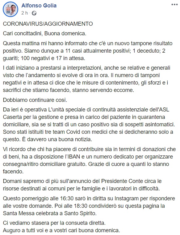 Questo quanto apprendiamo dalla pagina facebook del Sindaco Golia: