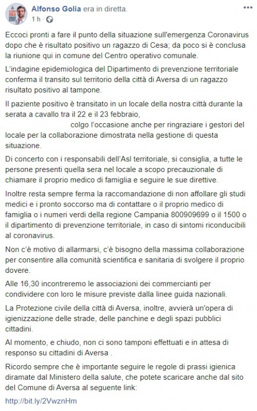 Questo parte di quanto pubblicato sulla pagina facebook del Sindaco Golia: