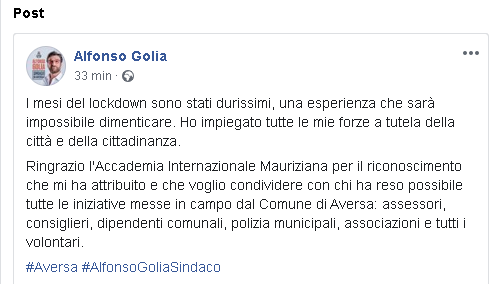 "I mesi del lockdown sono stati durissimi, una esperienza che sarà impossibile dimenticare. Ho impiegato tutte le mie forze a tutela della città e della cittadinanza. Ringrazio l'Accademia Internazionale Mauriziana per il riconoscimento che mi ha attribuito e che voglio condividere con chi ha reso possibile tutte le iniziative messe in campo dal Comune di Aversa: assessori, consiglieri, dipendenti comunali, polizia municipali, associazioni e tutti i volontari."