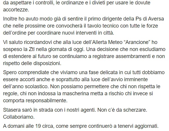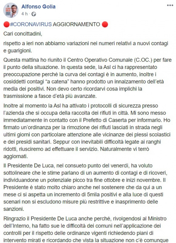 Questo quanto apprendiamo dalla pagina facebook del Sindaco Golia:
