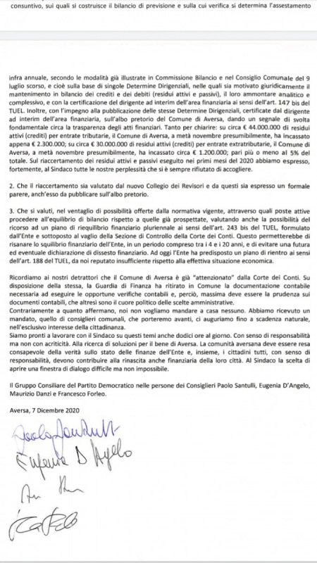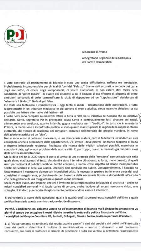 Ecco il testo della lettera inviata al Sindaco di Aversa dai consiglieri Santulli, D'Angelo, Forleo e Danzi. Naturalmente noi siamo a disposizione di chiunque voglia replicare e dire la sua.