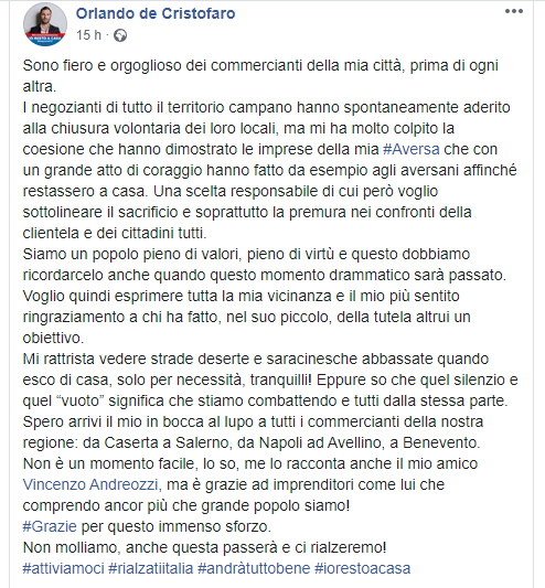 "Sono fiero e orgoglioso dei commercianti della mia città, prima di ogni altra. I negozianti di tutto il territorio campano hanno spontaneamente aderito alla chiusura volontaria dei loro locali, ma mi ha molto colpito la coesione che hanno dimostrato le imprese della mia Aversa che con un grande atto di coraggio hanno fatto da esempio agli aversani affinché restassero a casa. Una scelta responsabile di cui però voglio sottolineare il sacrificio e soprattutto la premura nei confronti della clientela e dei cittadini tutti. Siamo un popolo pieno di valori, pieno di virtù e questo dobbiamo ricordarcelo anche quando questo momento drammatico sarà passato. Voglio quindi esprimere tutta la mia vicinanza e il mio più sentito ringraziamento a chi ha fatto, nel suo piccolo, della tutela altrui un obiettivo. Mi rattrista vedere strade deserte e saracinesche abbassate quando esco di casa, solo per necessità, tranquilli! Eppure so che quel silenzio e quel “vuoto” significa che stiamo combattendo e tutti dalla stessa parte. Spero arrivi il mio in bocca al lupo a tutti i commercianti della nostra regione: da Caserta a Salerno, da Napoli ad Avellino, a Benevento. Non è un momento facile, lo so, me lo racconta anche il mio amico Vincenzo Andreozzi, ma è grazie ad imprenditori come lui che comprendo ancor più che grande popolo siamo! Grazie per questo immenso sforzo. Non molliamo, anche questa passerà e ci rialzeremo!"