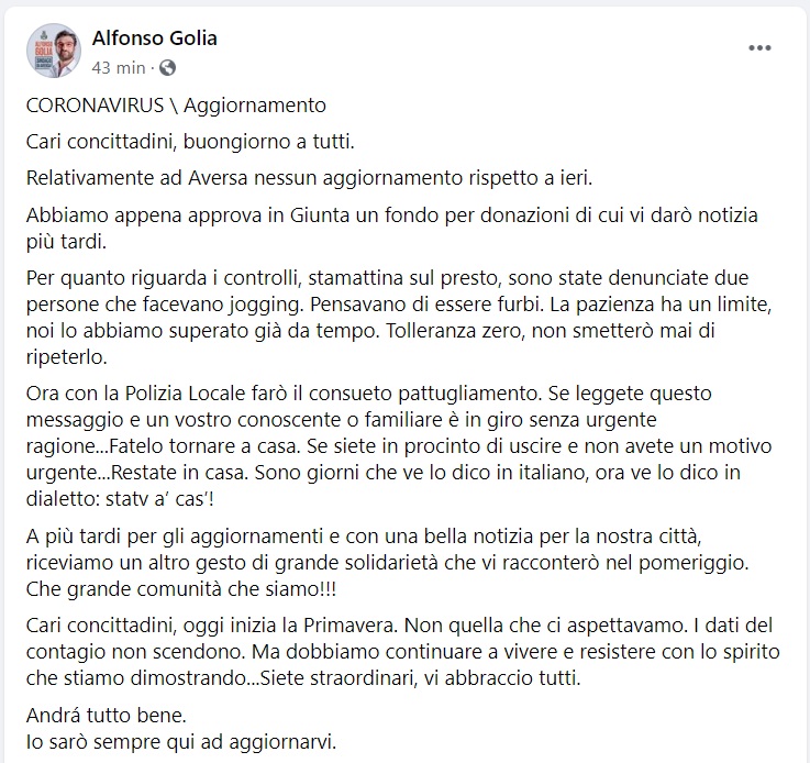 Questo quanto comunicato dal Sindaco Golia
