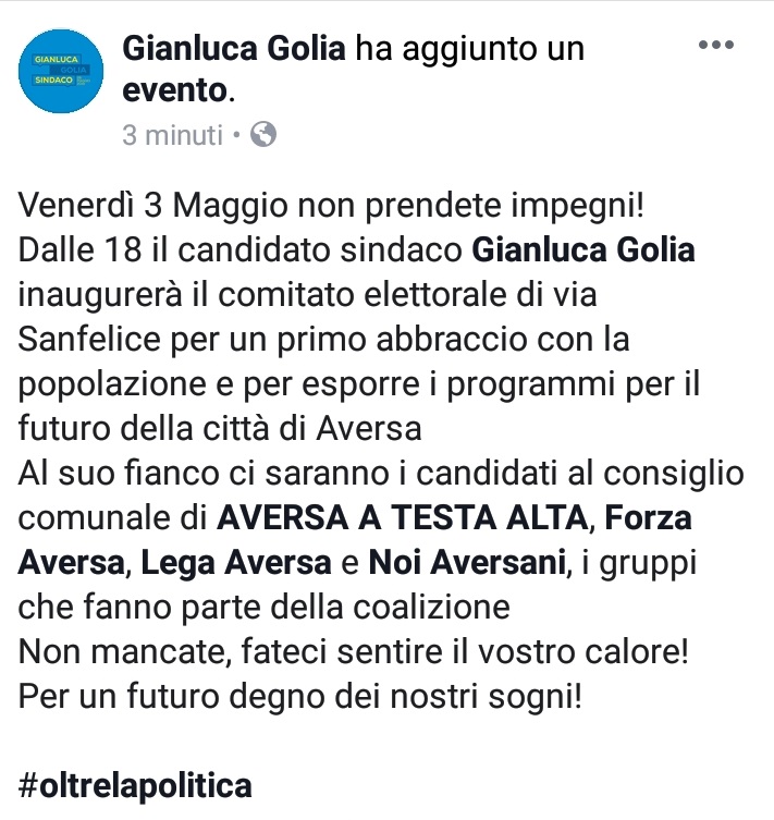 Lo apprendiamo dalla bacheca Facebook di Gianluca Golia, candidato Sindaco ad Aversa.