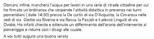 "...Domani, infine, mancherà l’acqua per lavori in una serie di strade cittadine per cui ho firmato un’ordinanza che sospende l’attività didattica in presenza nei turni pomeridiani ( dalle 14:30) presso la De curtis di via D’Acquisto, la Cimarosa nelle sedi di via Giotto via Riverso e via Rossa, la Pascoli e il plesso Linguiti di via Ovidio. Ho infatti chiesto e ottenuto un differimento dell’orario dell’intervento al pomeriggio e ridurre così i disagi alle scuole. A voi tutti auguro una buona serata".