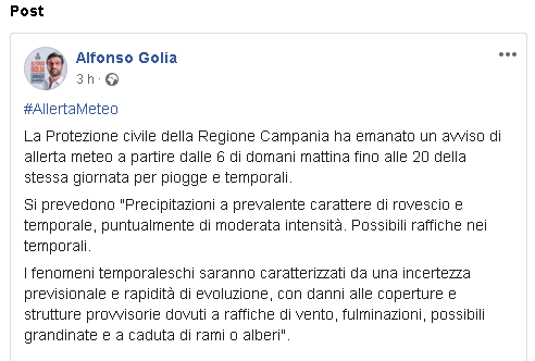 "Allerta meteo. La Protezione civile della Regione Campania ha emanato un avviso di allerta meteo a partire dalle 6 di domani mattina fino alle 20 della stessa giornata per piogge e temporali. Si prevedono "Precipitazioni a prevalente carattere di rovescio e temporale, puntualmente di moderata intensità. Possibili raffiche nei temporali. I fenomeni temporaleschi saranno caratterizzati da una incertezza previsionale e rapidità di evoluzione, con danni alle coperture e strutture provvisorie dovuti a raffiche di vento, fulminazioni, possibili grandinate e a caduta di rami o alberi".