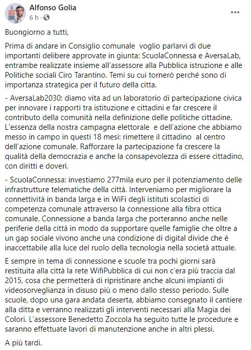 Questo quanto apprendiamo dalla pagina facebook del Sindaco Golia: