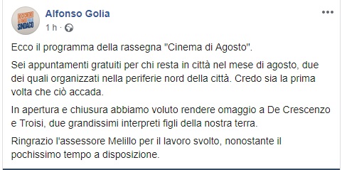 Questo il post pubblicato sulla pagina fb ufficiale del Sindaco di Aversa Alfonso Golia.