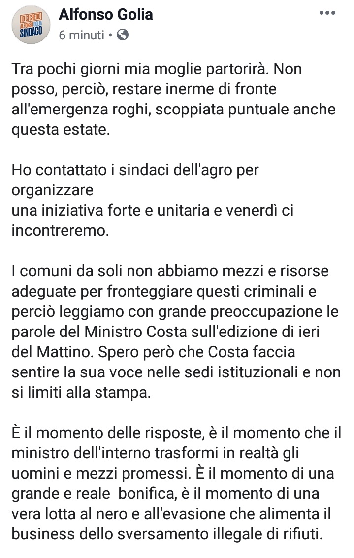 AVERSA. Emergenza roghi. Golia: "E' il momento delle risposte delle istituzioni"